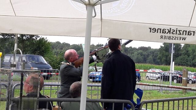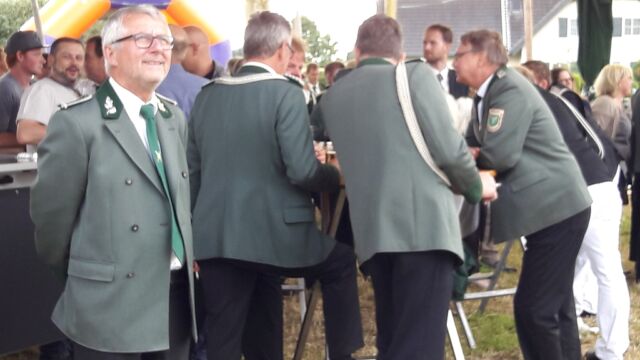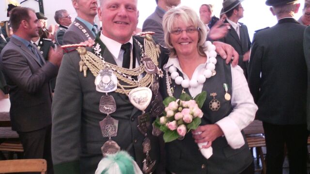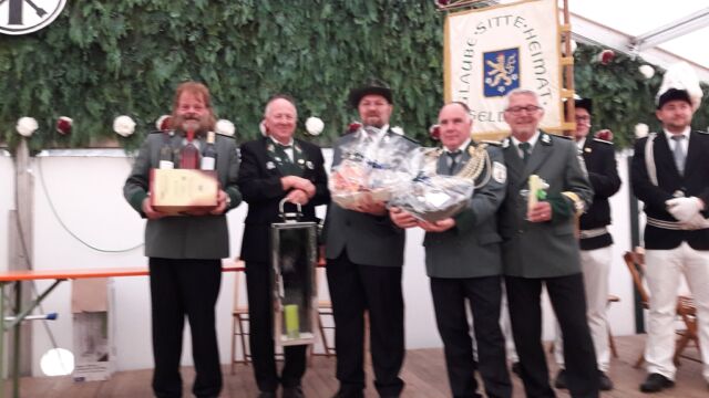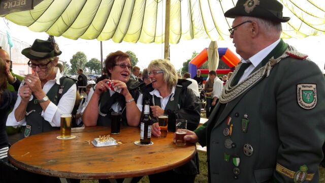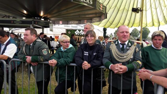 Im Rahmen ihres jährlichen Schützenfestes richtete die St. Maria Magdalena Bruderschaft Boeckelt in diesem Jahr auch das Bezirksschützenfest aus. Es war ein sehr schönes Fest, nur der Wettergott hat es nicht wirklich gut mit den Schützen gemeint. Immer wieder gingen Schauern über dem Festplatz nieder. Trotzdem ließen sich die Gastgeber und die Gäste nicht daran hindern, das Fest und die Wettkämpfe ausgiebig zu genießen. Zunächst wurden in einem Preisfahnenschwenken die besten Fahnenschwenker ermittelt. Zeitgleich fand das Preisvogelschießen statt. In diesem Wettkampf stellte auch Vernum mit Prof. Dr. Reinhard Winkler und Yogi Perau 2 von insgesamt 5 „Gewinnern“. Mit dem letzten Wettkampf wurde der Bezirksschützenkönig ermittelt. Unter anderem wollte auch unser König Werner Krenz die Bezirksschützenkönigswürde für sich und den Verein nach Vernum holen. Ihm blieb die letzte Chance jedoch verwehrt. Einen Schuss, bevor er wieder ins Geschehen hätte eingreifen können, fiel die Schießscheibe von der Stange. Von dieser Stelle herzlichen Glückwunsch an Dirk Aldenpaß von der Vereinigten Sankt Georgi- und Liebfrauen Bruderschaft Kapellen 2006 e.V., der sich diesen Titel hart erkämpfte.