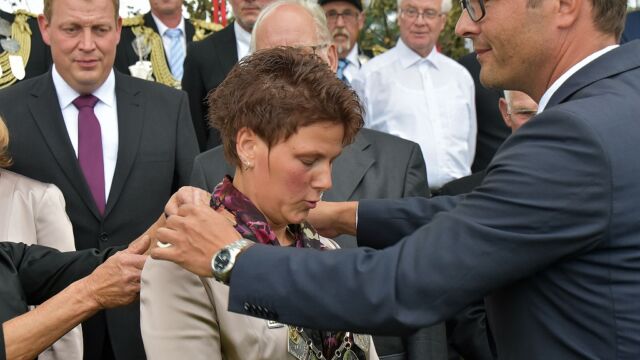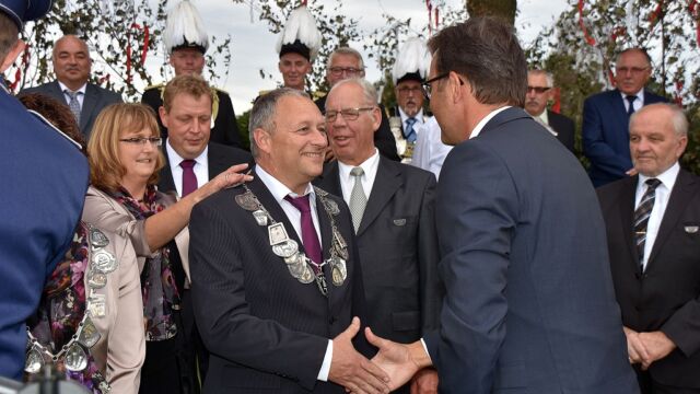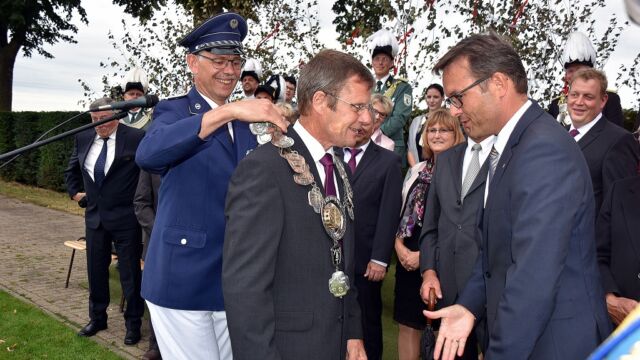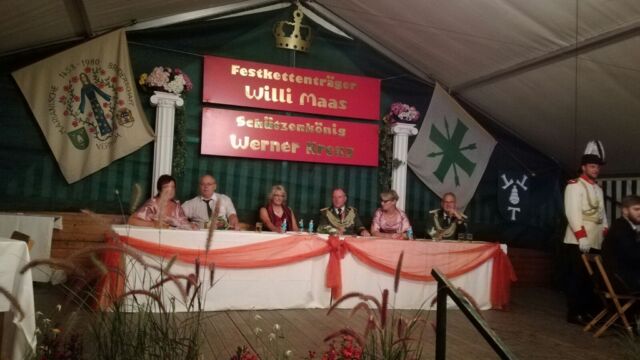 Am Freitag trafen sich alle geladenen Vereine um 17.45 Uhr auf dem Vernumer Sportplatz. Bei herrlichem Wetter fand dort der Festakt zur Ehrung des neuen Festkettenträgers Willi Maas und seiner Adjutanten Isabelle van de Kamp-Böhm und Michael Croonenbroeck statt. Ihnen zur Seite standen ihre Ehe-/Partner Maria Maas, Marcus Böhm und Cornelia Arendes. Die Festkette der Vereinsgemeinschaft Hartefeld-Vernum-Poelyck wurde den Geehrten vom Bürgermeister der Stadt Geldern Sven Kaiser verliehen, der zuvor in einer Laudatio die vielen großen und kleinen Dinge erwähnte, die der Anlass für diese Auszeichnung waren. Nach den Festreden fand ein großes Fahnenschwenken und der Festumzug durch den Ort statt. Dann ging es direkt in Zelt zum „Ball des Festkettenträgers“.