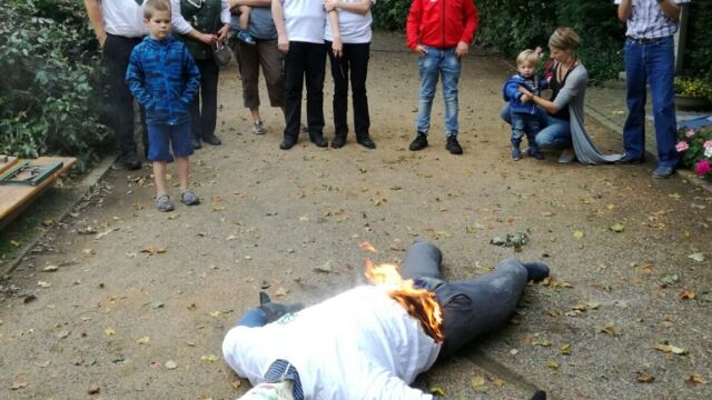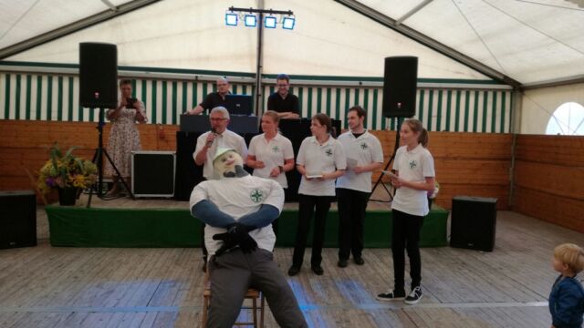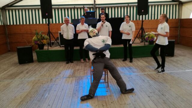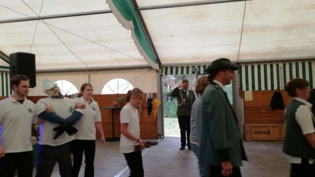Am Sonntag allerdings machte die gute Laune des Wettergottes eine Pause. Der Tag startete für die geladenen Vereine mit der Festmesse in der St. Antonius Kirche Hartefeld. Der geplante gemeinsame Marsch zum Vernumer Festzelt musste allerdings wegen Regens ausfallen. Während fast alle Gäste den Weg mit Fahrzeugen zurücklegten waren es nur die alle-Wetter-erprobten Pfadfinder die es sich nicht nehmen ließen, nach Vernum zu marschieren. Entsprechend wurden sie in Vernum mit einem „Einmarsch“ in Zelt belohnt. Trotz einiger heftiger Regengüsse feierten die Gäste den Kirmesausklang bei einem zünftigen Frühschoppen mit anschließendem Verbrennen der Kirmespuppe. Für die kleinen Gäste hatte die Bruderschaft eine Hüpfburg aufstellen lassen und die Ballonkünstlerin „Eva“ engagiert.