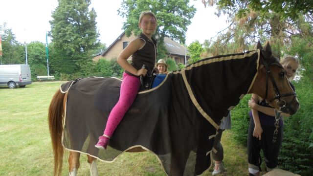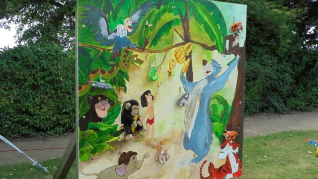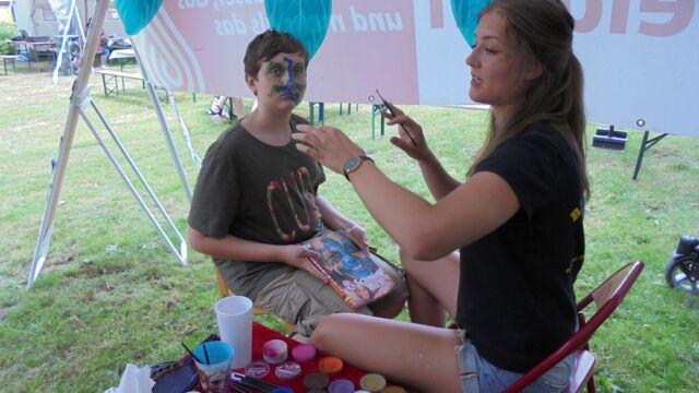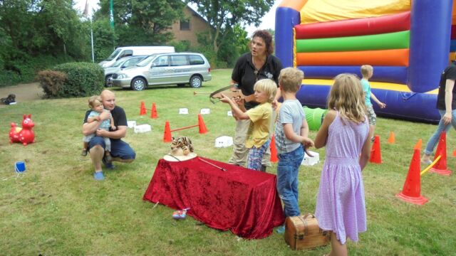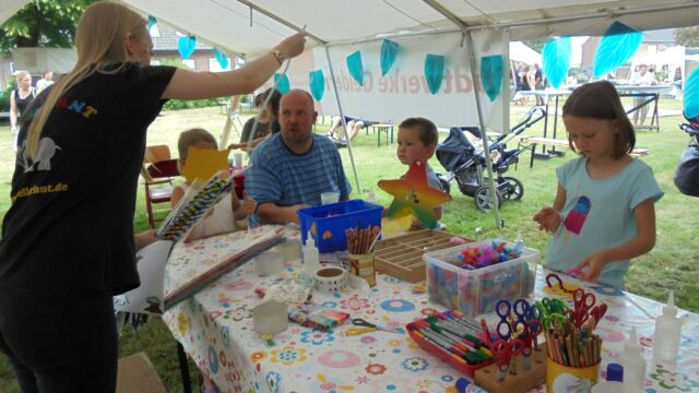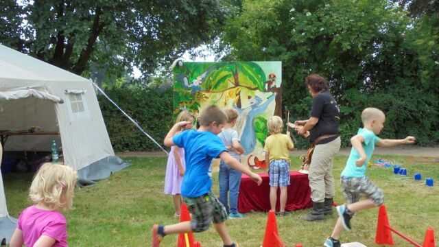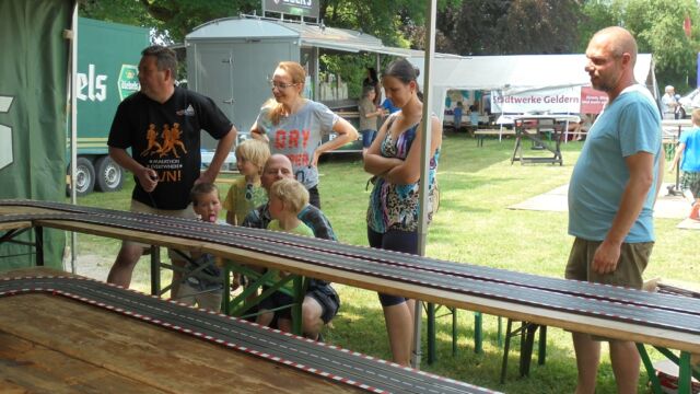 Beim großen Familienfest am Sonntag  hatten die Organisatoren ein großes Spielangebot für Kinder unterschiedlichen Alters organisiert, dass von kleinen und großen Kindern gerne angenommen wurde. Neben der großen Hüpfburg, die alljährlich von den Stadtwerken Geldern gesponsert wird, einer große Carrera-Bahn, wo große und kleine Rennfahrer ihr Glück im Autorennen versuchen konnten und Ponyreiten  war „Bellerfant“ vor Ort, die ein großes Spiel- und  Bastelangebot zum Thema „Dschungel“ im Gepäck hatten. Für Langeweile war also keine Zeit.