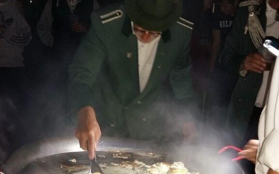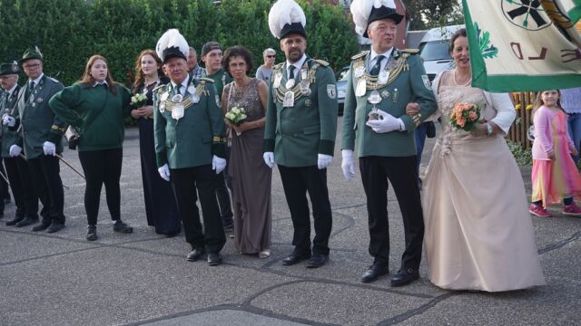 Der Kirmesfreitag stand ganz im Zeichen des diesjährigen Festkettenträgers Norbert Clancett. Der Tag des Festkettenträgers begann mit einem gemeinsamen Gottesdienst um 17.30 Uhr in der St.Antonius Kirche in Hartefeld. Nach dem Antreten und dem Marsch zur Pastoratswiese ließ es sich Gelderns Bürgermeister Sven Kaiser nicht nehmen, persönlich in einer Laudatio die zahlreichen Verdienste des Festkettenträgers hervorzuheben. Für den Festkettenträger gab es einen doppelten Anlass zu feiern, denn Norbert Clancett beging an diesem Tag auch seinen 49. Geburtstag. Wäre das nicht schon Grund genug zu feiern, begab es sich, dass unser König Olli Lenz ebenfalls an diesem Tag Geburtstag hat und so ließen es sich die beiden nicht nehmen, alle Anwesenden mit einem gekühlten Getränk zu versorgen. Nach der Übergabe der Festkette und einem feierlichen Fahnenschwenken machte sich der Zug auf den Weg nach Vernum. Mit musikalischer Unterstützung durch Blau-Weiß Hartefeld war der Weg schnell geschafft und das Festzelt auf der Brunnenwiese in Vernum erreicht. Auf dem Ball des Festkettenträgers sorgte die Band „Herzschlag“ für beste Laune und ausgelassene Stimmung.