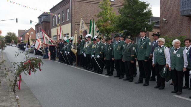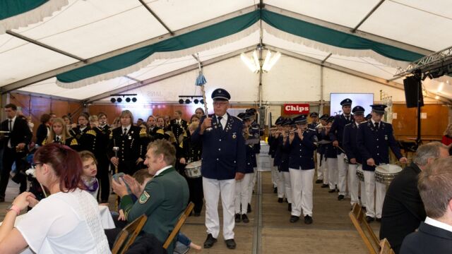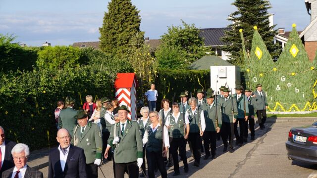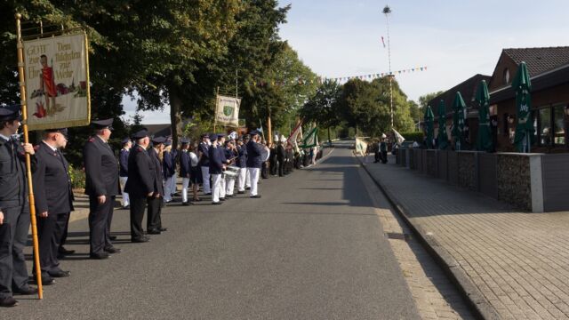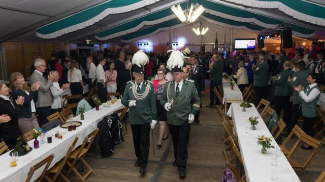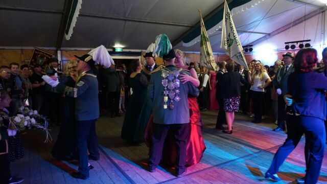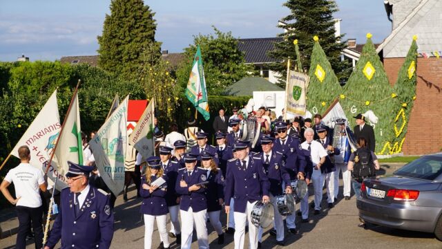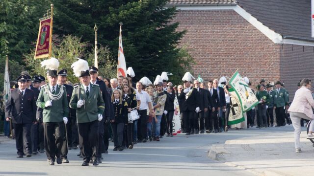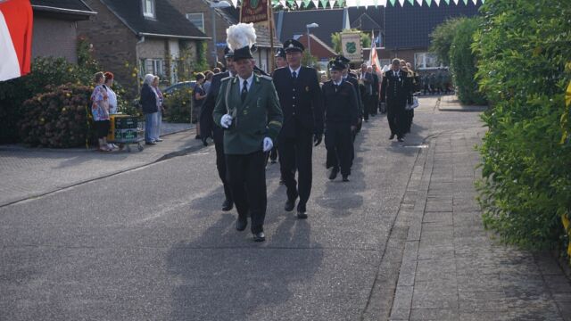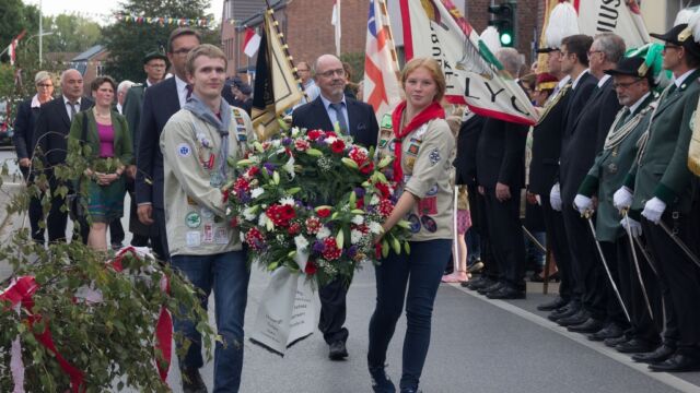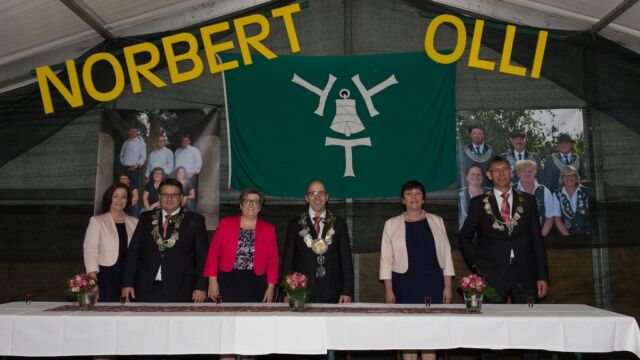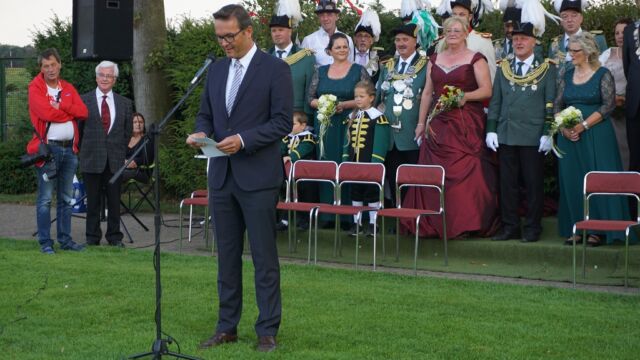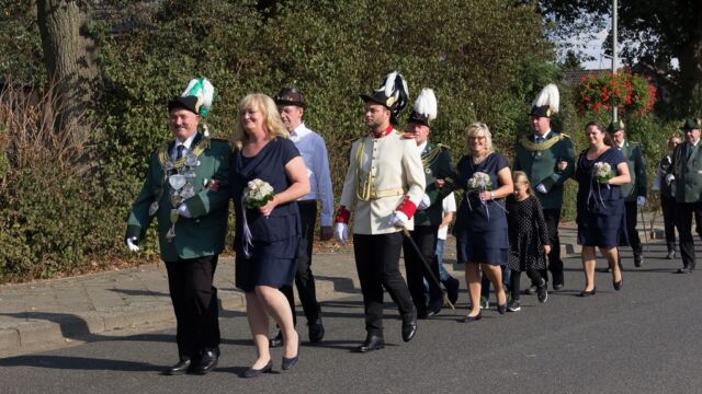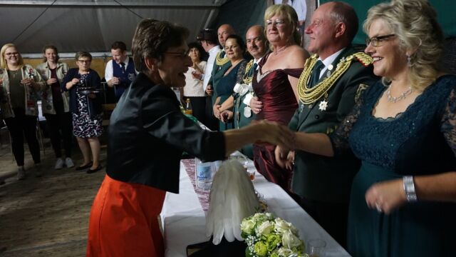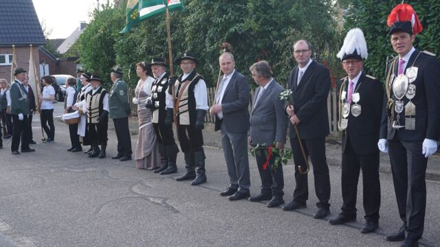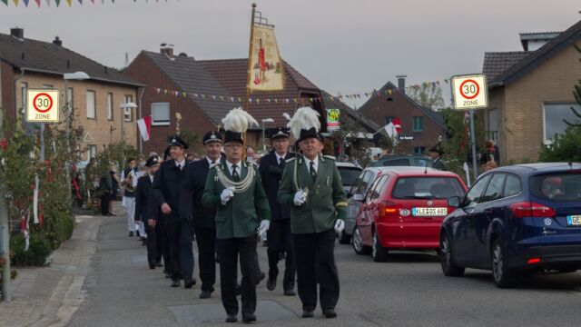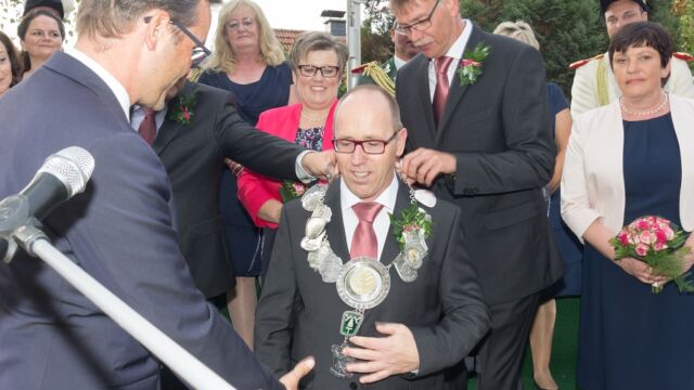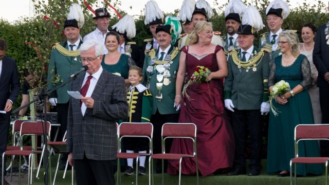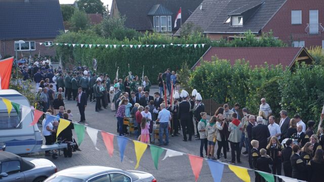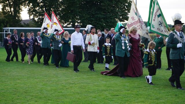 Der Kirmesfreitag stand ganz im Zeichen des diesjährigen Festkettenträgers Norbert Clancett. Der Tag des Festkettenträgers begann mit einem gemeinsamen Gottesdienst um 17.30 Uhr in der St.Antonius Kirche in Hartefeld. Nach dem Antreten und dem Marsch zur Pastoratswiese ließ es sich Gelderns Bürgermeister Sven Kaiser nicht nehmen, persönlich in einer Laudatio die zahlreichen Verdienste des Festkettenträgers hervorzuheben. Für den Festkettenträger gab es einen doppelten Anlass zu feiern, denn Norbert Clancett beging an diesem Tag auch seinen 49. Geburtstag. Wäre das nicht schon Grund genug zu feiern, begab es sich, dass unser König Olli Lenz ebenfalls an diesem Tag Geburtstag hat und so ließen es sich die beiden nicht nehmen, alle Anwesenden mit einem gekühlten Getränk zu versorgen. Nach der Übergabe der Festkette und einem feierlichen Fahnenschwenken machte sich der Zug auf den Weg nach Vernum. Mit musikalischer Unterstützung durch Blau-Weiß Hartefeld war der Weg schnell geschafft und das Festzelt auf der Brunnenwiese in Vernum erreicht. Auf dem Ball des Festkettenträgers sorgte die Band „Herzschlag“ für beste Laune und ausgelassene Stimmung.