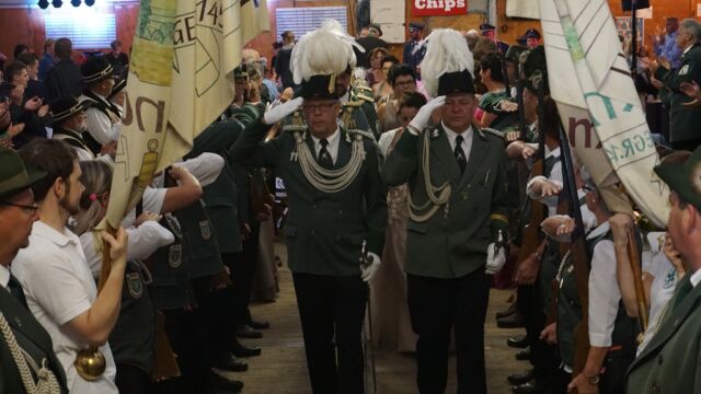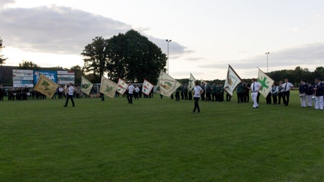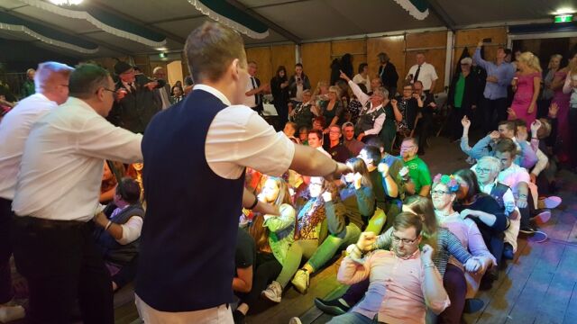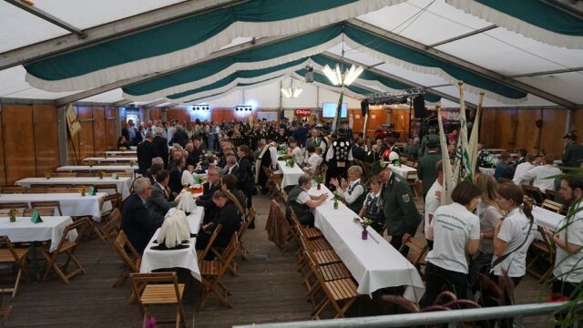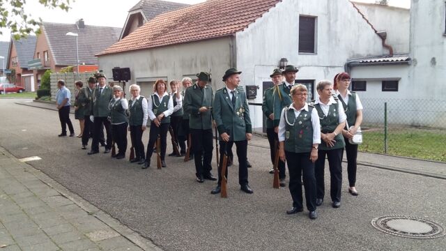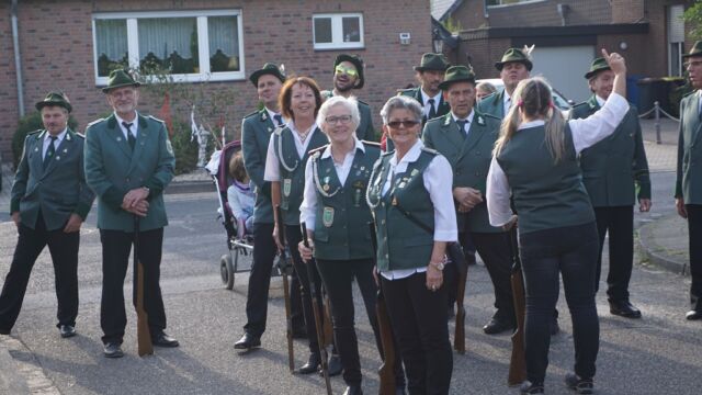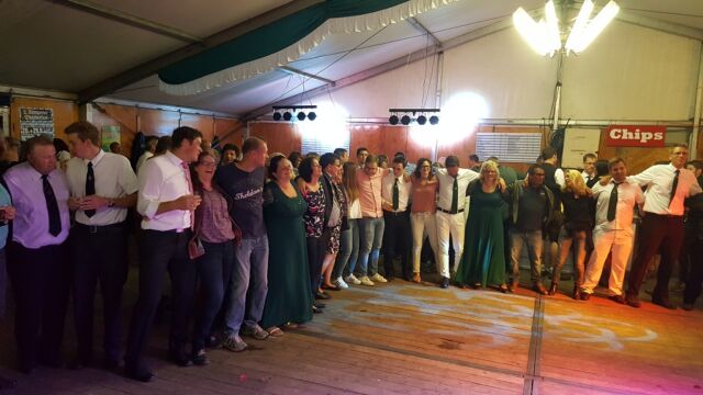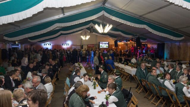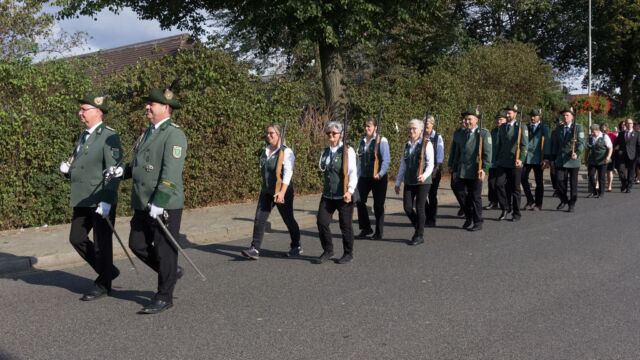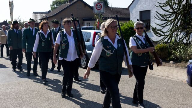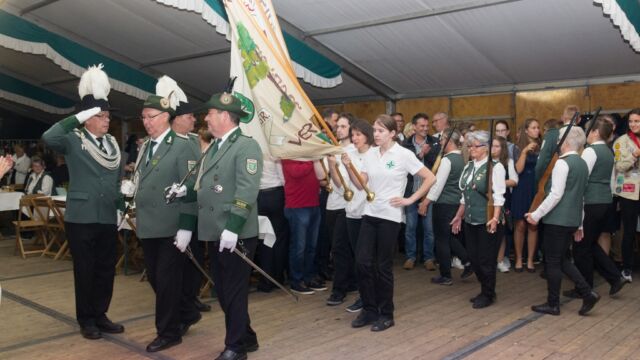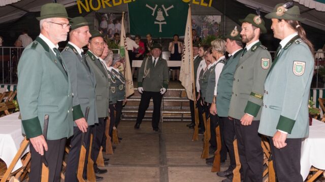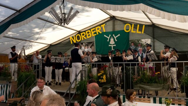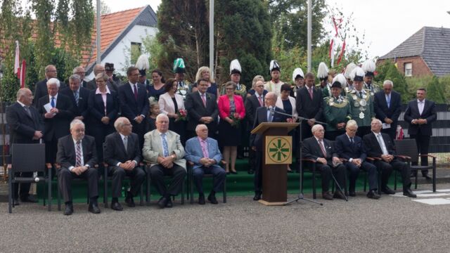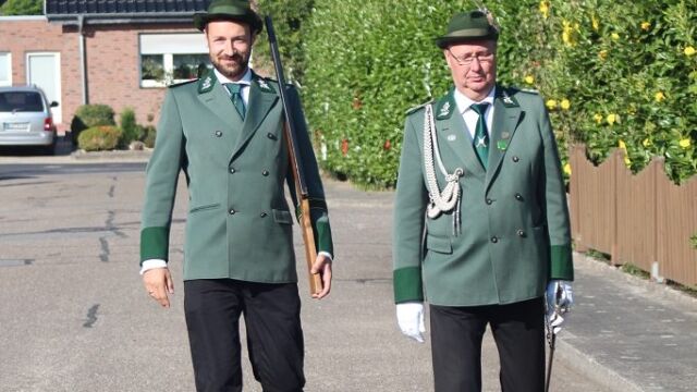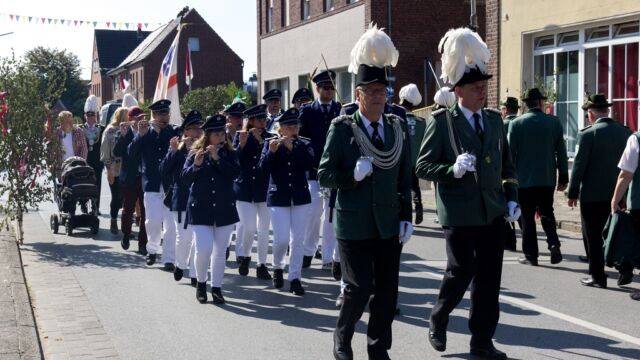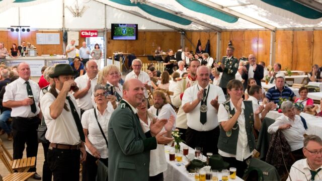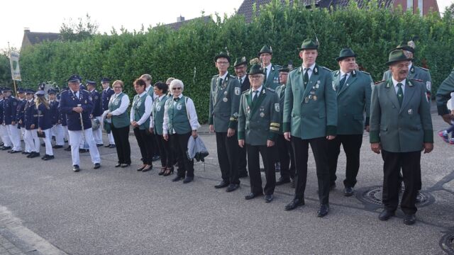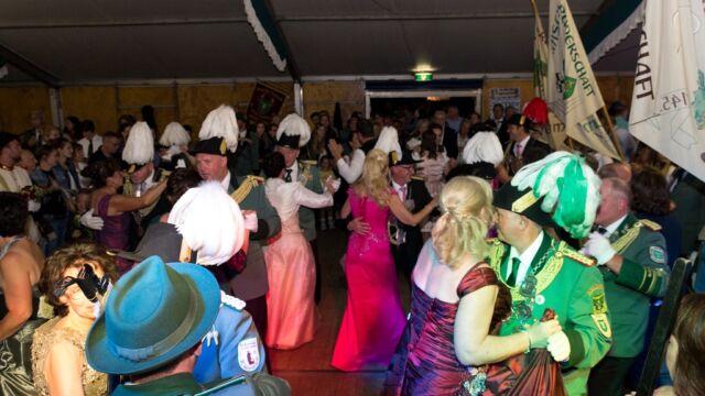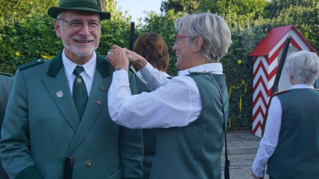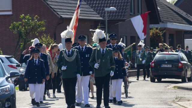 Der Kirmesfreitag stand ganz im Zeichen des diesjährigen Festkettenträgers Norbert Clancett. Der Tag des Festkettenträgers begann mit einem gemeinsamen Gottesdienst um 17.30 Uhr in der St.Antonius Kirche in Hartefeld. Nach dem Antreten und dem Marsch zur Pastoratswiese ließ es sich Gelderns Bürgermeister Sven Kaiser nicht nehmen, persönlich in einer Laudatio die zahlreichen Verdienste des Festkettenträgers hervorzuheben. Für den Festkettenträger gab es einen doppelten Anlass zu feiern, denn Norbert Clancett beging an diesem Tag auch seinen 49. Geburtstag. Wäre das nicht schon Grund genug zu feiern, begab es sich, dass unser König Olli Lenz ebenfalls an diesem Tag Geburtstag hat und so ließen es sich die beiden nicht nehmen, alle Anwesenden mit einem gekühlten Getränk zu versorgen. Nach der Übergabe der Festkette und einem feierlichen Fahnenschwenken machte sich der Zug auf den Weg nach Vernum. Mit musikalischer Unterstützung durch Blau-Weiß Hartefeld war der Weg schnell geschafft und das Festzelt auf der Brunnenwiese in Vernum erreicht. Auf dem Ball des Festkettenträgers sorgte die Band „Herzschlag“ für beste Laune und ausgelassene Stimmung.