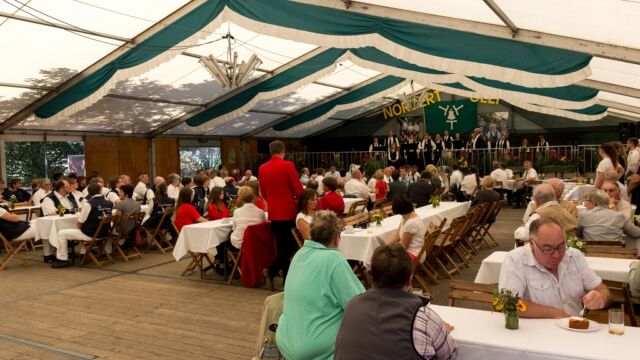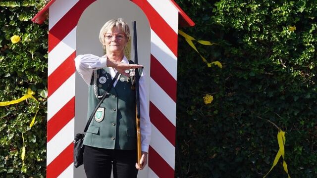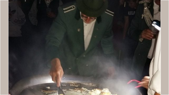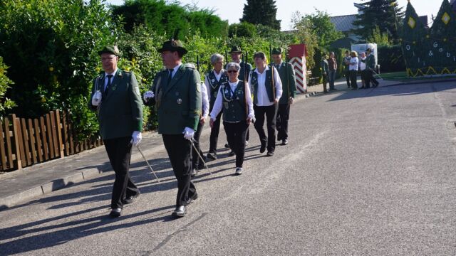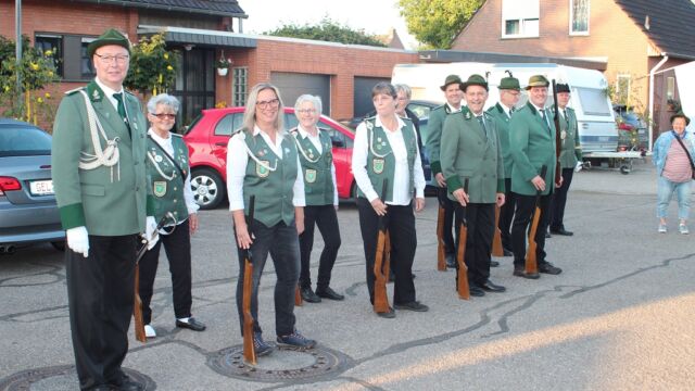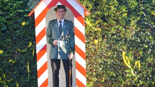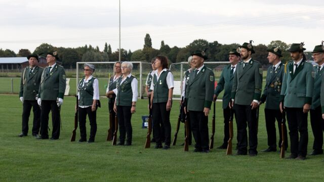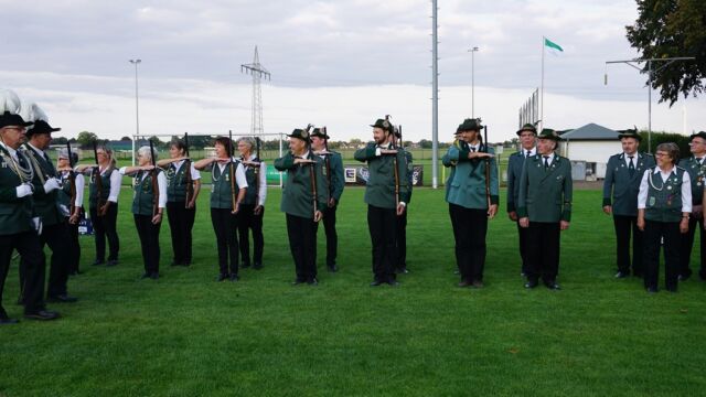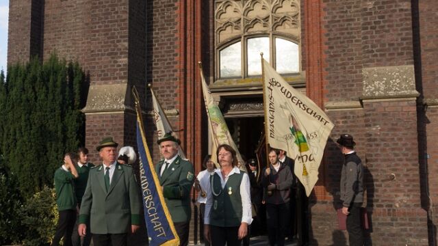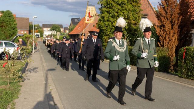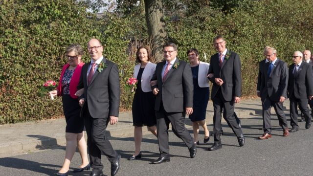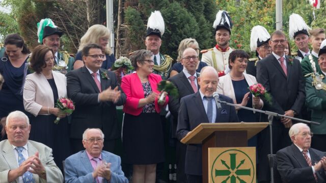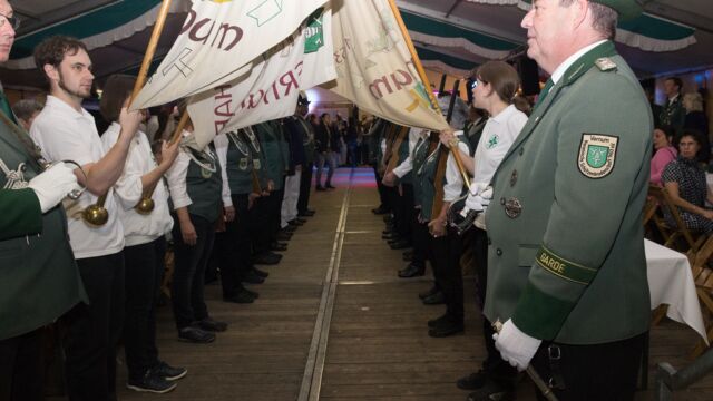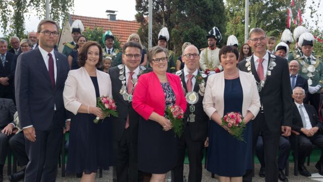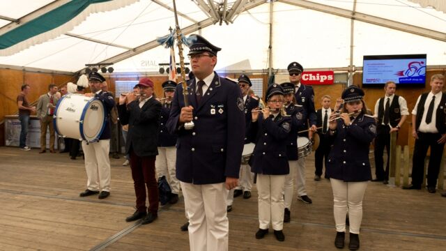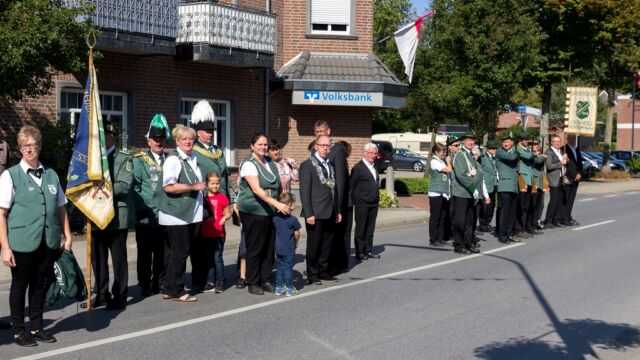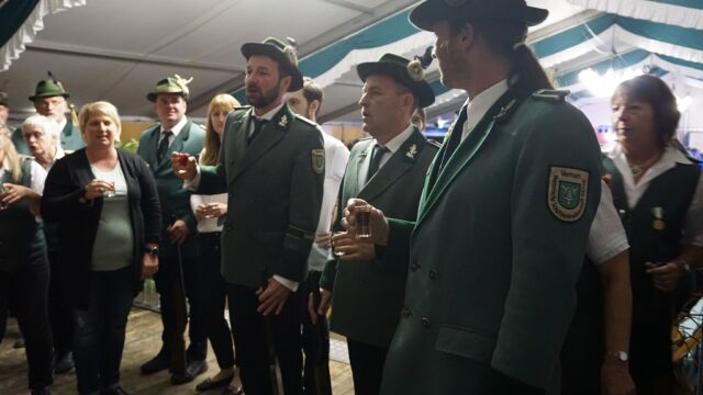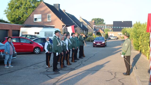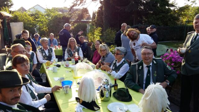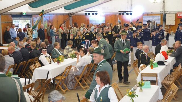 Der Kirmesfreitag stand ganz im Zeichen des diesjährigen Festkettenträgers Norbert Clancett. Der Tag des Festkettenträgers begann mit einem gemeinsamen Gottesdienst um 17.30 Uhr in der St.Antonius Kirche in Hartefeld. Nach dem Antreten und dem Marsch zur Pastoratswiese ließ es sich Gelderns Bürgermeister Sven Kaiser nicht nehmen, persönlich in einer Laudatio die zahlreichen Verdienste des Festkettenträgers hervorzuheben. Für den Festkettenträger gab es einen doppelten Anlass zu feiern, denn Norbert Clancett beging an diesem Tag auch seinen 49. Geburtstag. Wäre das nicht schon Grund genug zu feiern, begab es sich, dass unser König Olli Lenz ebenfalls an diesem Tag Geburtstag hat und so ließen es sich die beiden nicht nehmen, alle Anwesenden mit einem gekühlten Getränk zu versorgen. Nach der Übergabe der Festkette und einem feierlichen Fahnenschwenken machte sich der Zug auf den Weg nach Vernum. Mit musikalischer Unterstützung durch Blau-Weiß Hartefeld war der Weg schnell geschafft und das Festzelt auf der Brunnenwiese in Vernum erreicht. Auf dem Ball des Festkettenträgers sorgte die Band „Herzschlag“ für beste Laune und ausgelassene Stimmung.