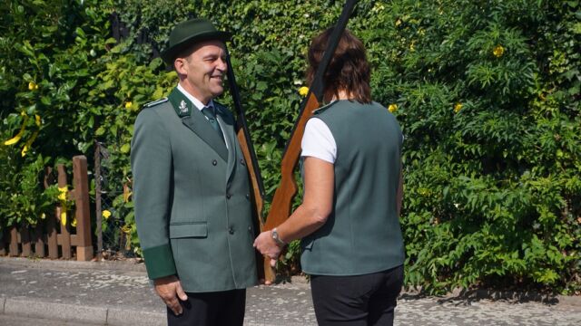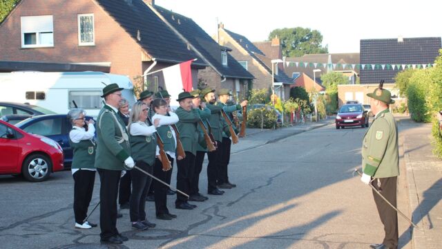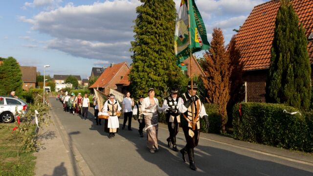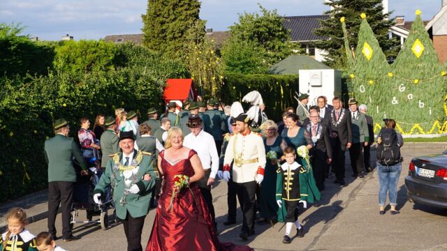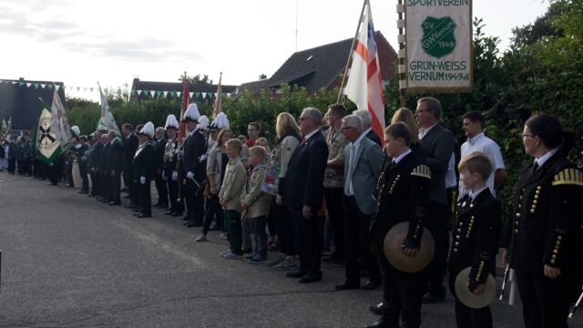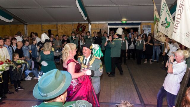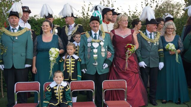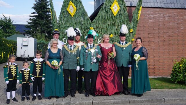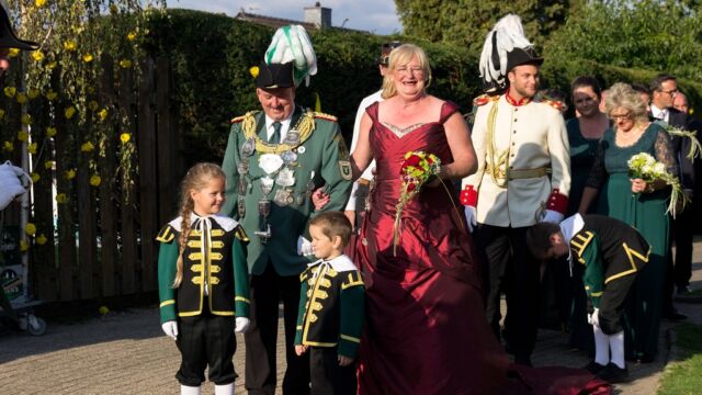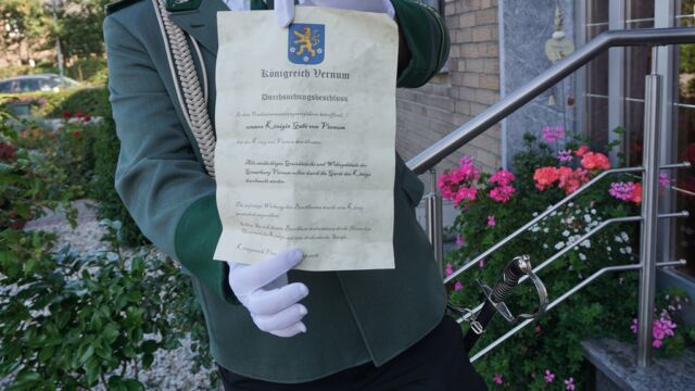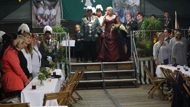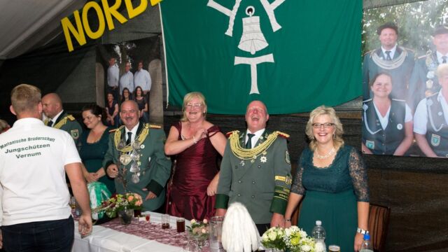Am Kirmessamstag stand unser König Olli Lenz im Mittelpunkt des Geschehens. Bereits um kurz vor 08.00 Uhr hatte sich der Hofstaat im Königshaus versammelt und fieberte dem traditionellen Wecken durch den Spielmannszug Blau-Weiß Hartefeld entgegen. Während der Spielmannszug zusammen mit dem Königsadjutanten Jens Krenz noch einige „Weckstationen“ vor der Brust hatte, wurde das Königshaus den ganzen Tag von der Ehrengarde der Bruderschaft bewacht. Und auch bei der Entführung der Königin zeigte sich die Stärke der Ehrengarde. Mit vereinten Kräften durchsuchten die Erdengardisten zahlreiche Vernumer Grundstücke und Häuser bis sie die Königin wohlbehalten in den Königspalast zurückbringen konnten. Um 17:30 Uhr hieß es für die geladenen Vereine Antreten auf dem Sportplatz und Abholen des Hofstaates. Nach einem stärkenden Umtrunk am Hause des Königs folgten der Umzug durch Vernum und der Festakt auf dem Sportplatz. Ein strahlend blauer Himmel begleitete den Festumzug durch Vernum, welcher auch an diesem Tag im Festzelt an der Brunnenwiese endete. Der große „Königsgalaball“ stand ganz im Zeichen unseres Schützenkönigs Olli Lenz und seiner Frau Gabi, sowie den Ministerpaaren Werner und Anita Krenz als auch Marc und Dominika Blomberg. Wiedermal sorgte die Band „Herzschlag“ für einen unvergesslichen Abend bei ausgelassener Stimmung. Für die Vernumer Bruderschaft war es ein prachtvolles Schützenfest.